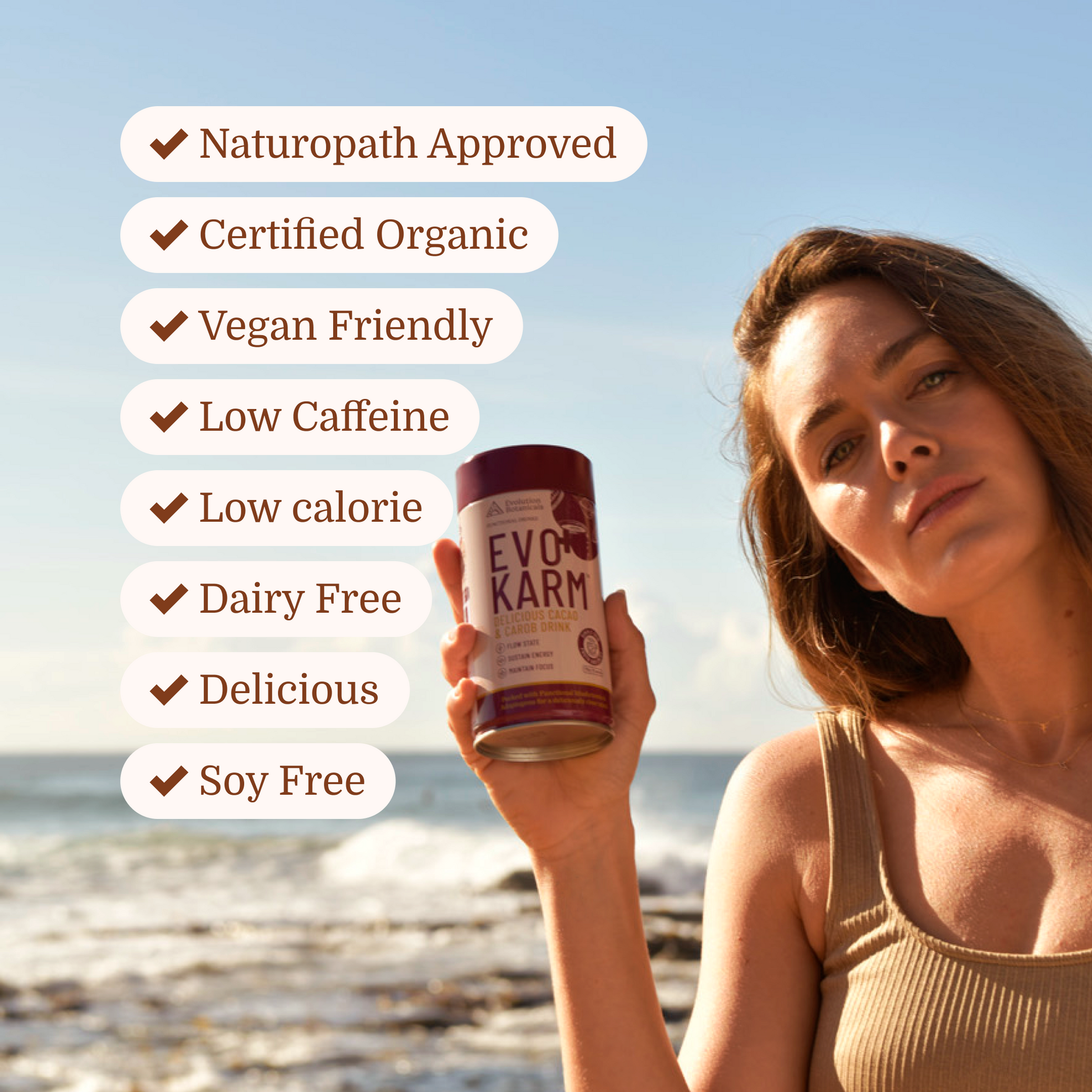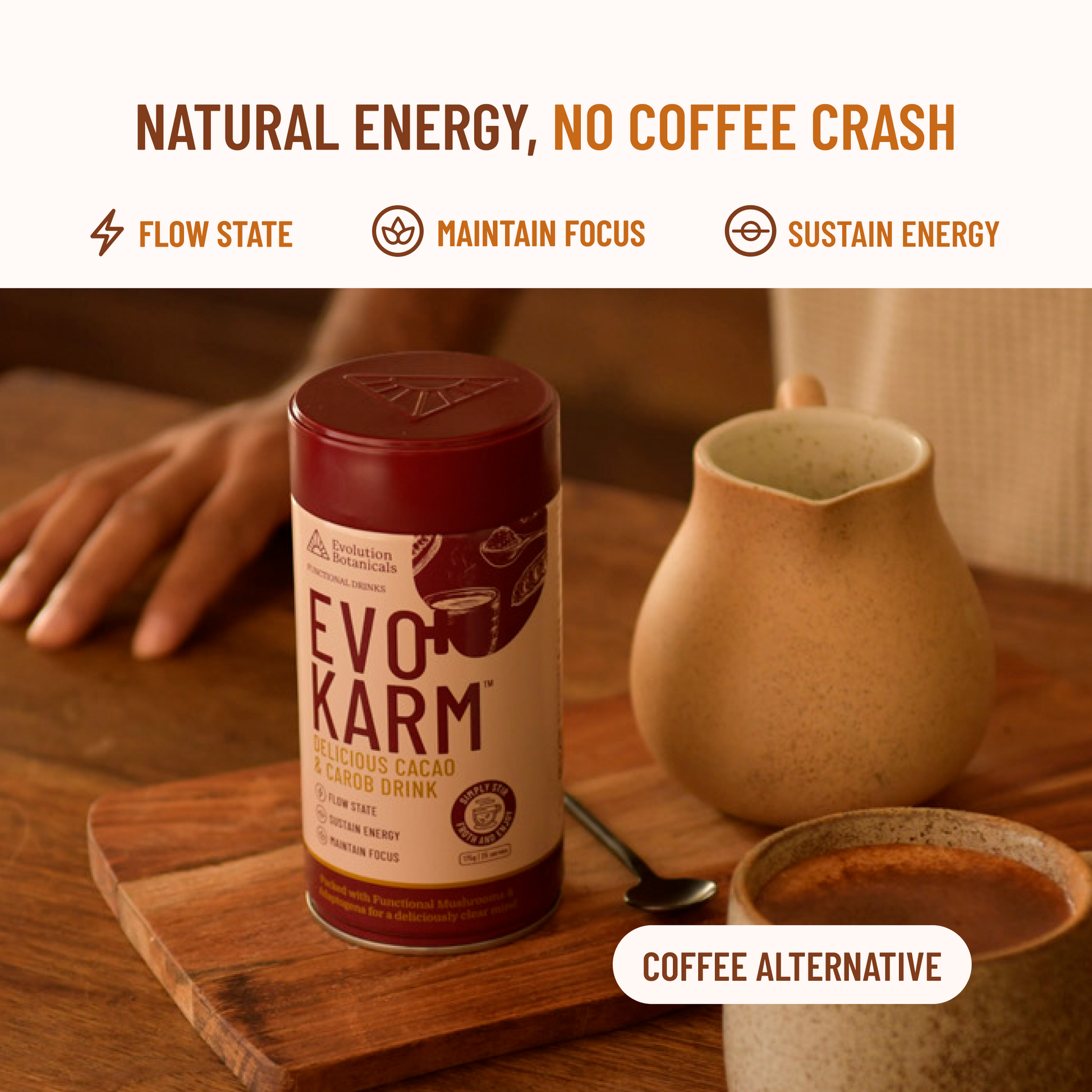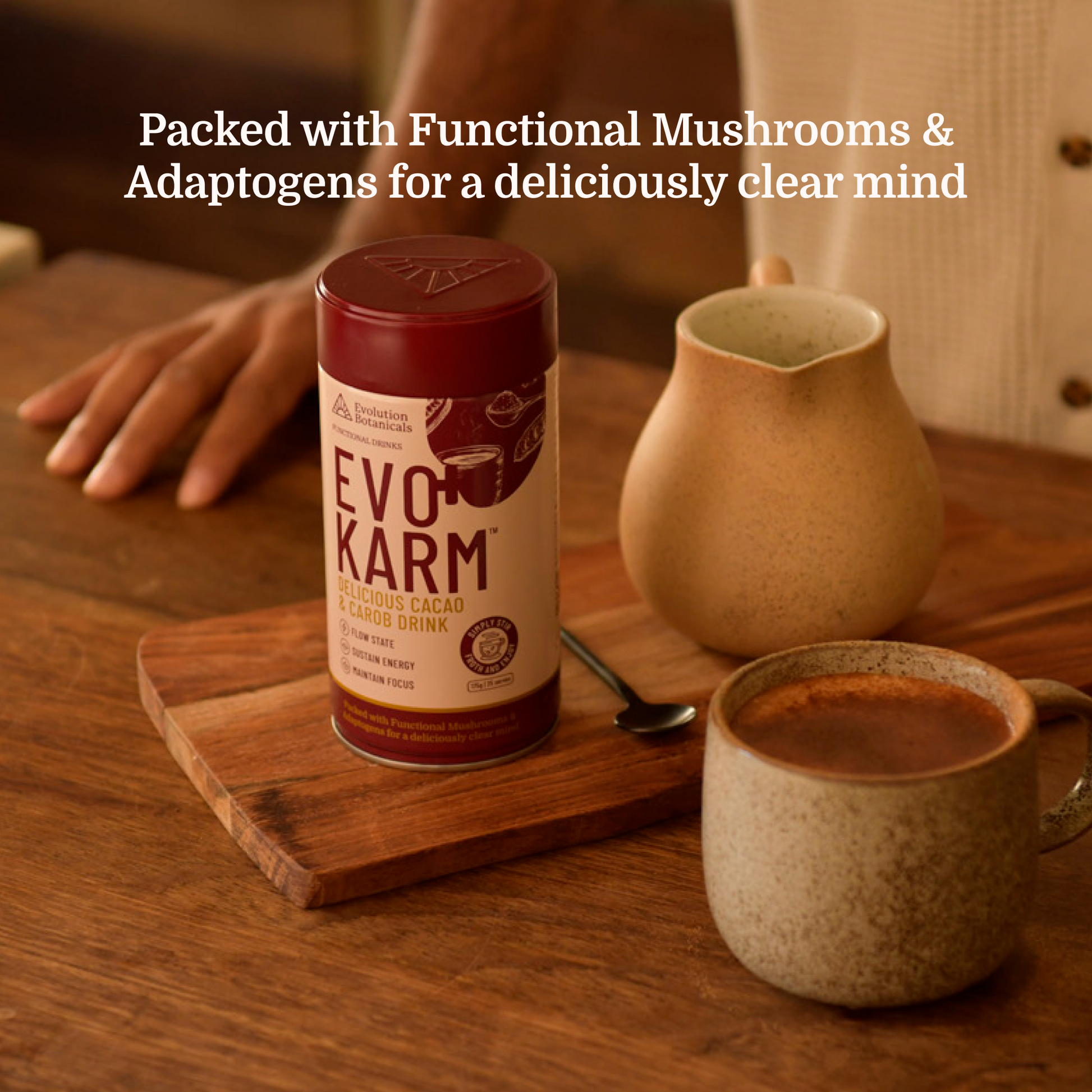 Maintain focus and calm with our Evo Karm™ drink, a deliciously smooth, naturally sweet blend of Organic Cacao and Carob. Enhanced with adaptogenic mushrooms and Ayurvedic herbs including Lion’s Mane, Cordyceps, and Holy Basil. Certified Organic, low caffeine, and free from nasties, this coffee alternative fuels flow state, sustained energy, and a deliciously clear mind.