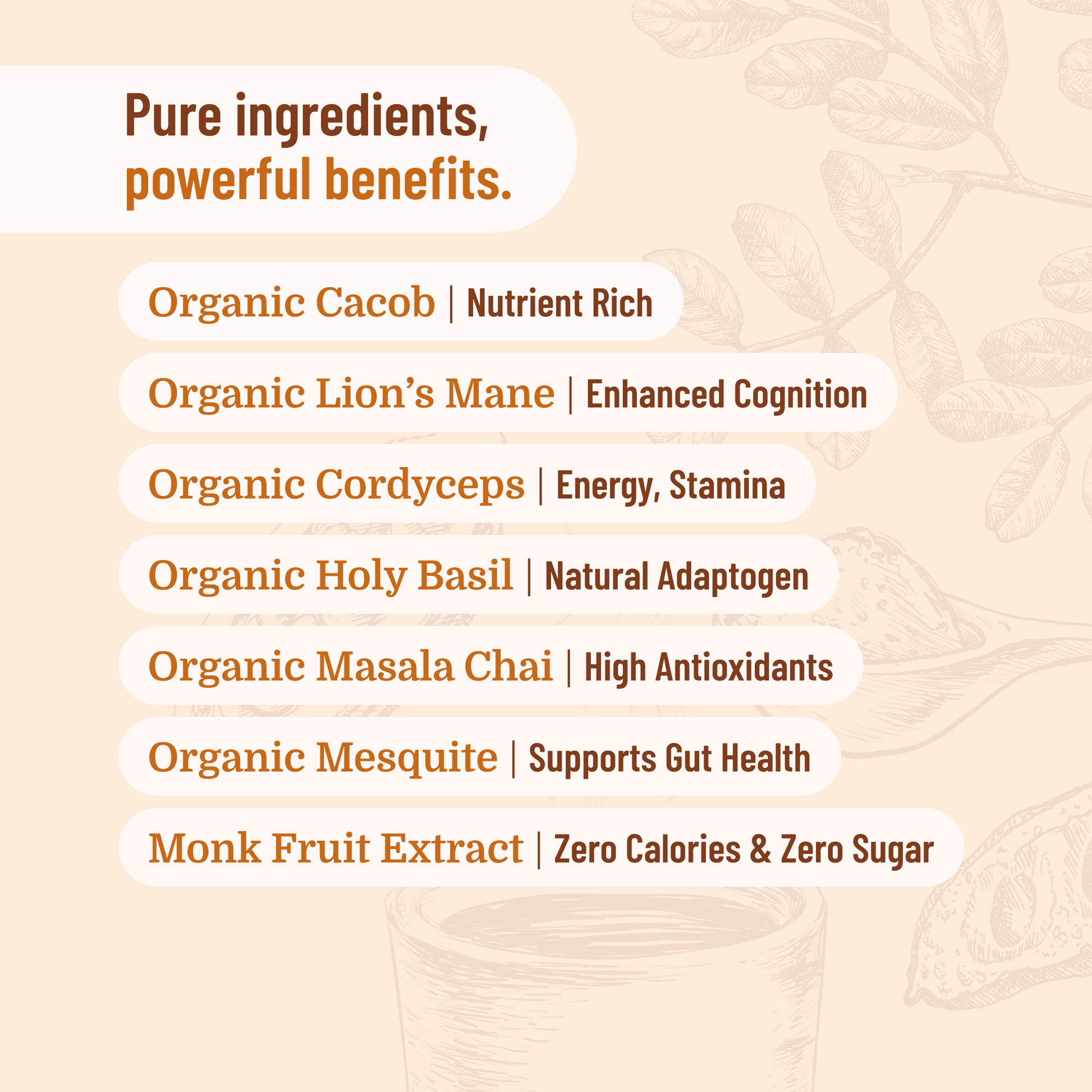 Organic Cacob™ (Cacao and Carob powder), Lions Mane powder, Cordycep militaris powder, Holy Basil (Tulsi) extract powder, Mesquite powder, Natural Vanilla flavour, Guar gum, Monk fruit extract powder, Cinnamon, Cardamom, Clove, Star anise, Liquorice, Nutmeg, Black Pepper, Himalayan salt. Free from Gluten, Dairy, Soy & Vegan.